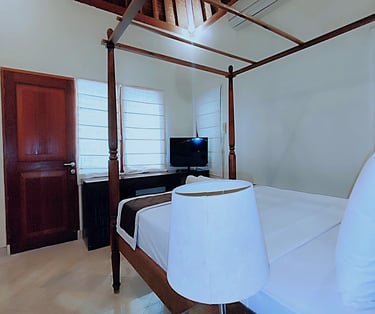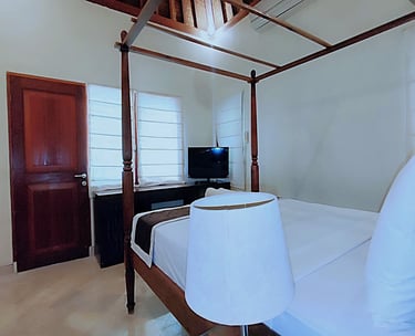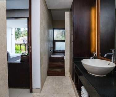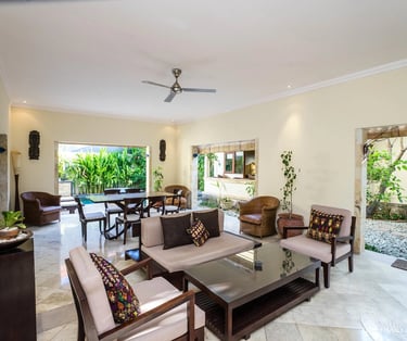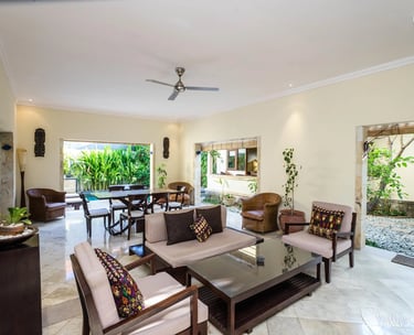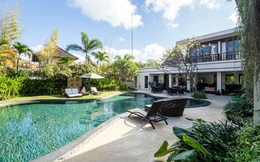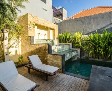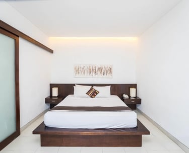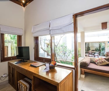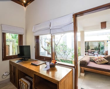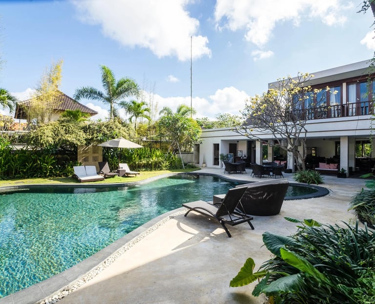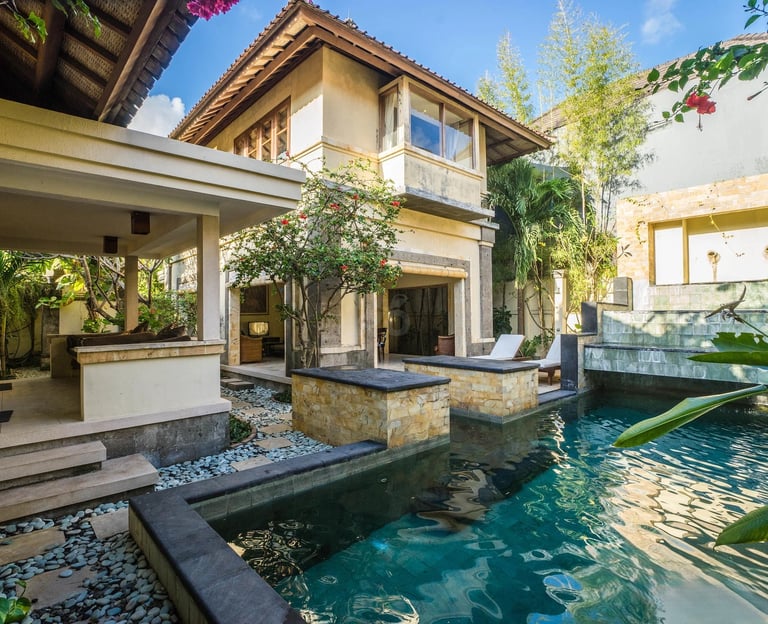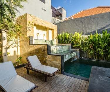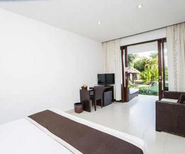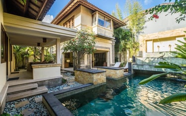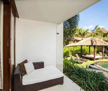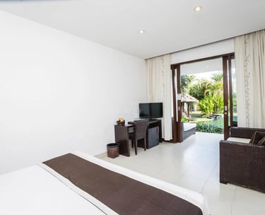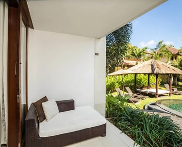 Our guest rooms surround a central swimming pool and garden, blending Balinese architecture with modern design, perfect for relaxation and comfort during your stay.