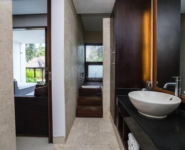 Experience luxury in our private bedroom villas, featuring spacious rooms, outdoor tropical showers, and a private kitchen, all overlooking the serene garden and pool.